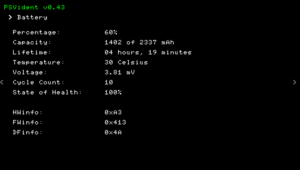 PSVidentを導入する最大のメリットの一つが、詳細なバッテリー情報の取得です。中古機体の状態判別や、交換時期の目安として非常に役立ちます。