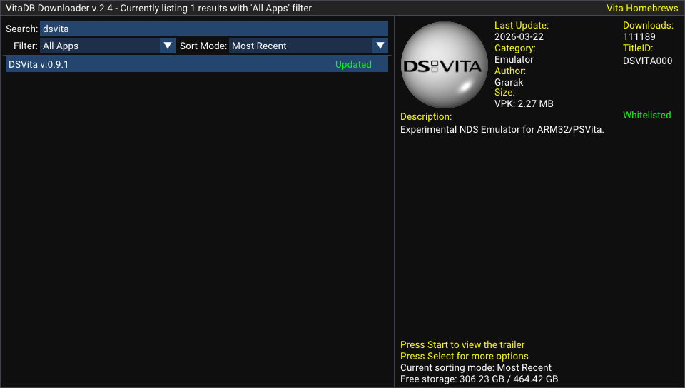 一覧に表示された「DSVita」を選択し、インストールを実行します。 この際、依存プラグインである kubridge.skprx が未導入の場合は、自動的にダウンロードの案内が表示されるので、指示に従ってインストールしてください。