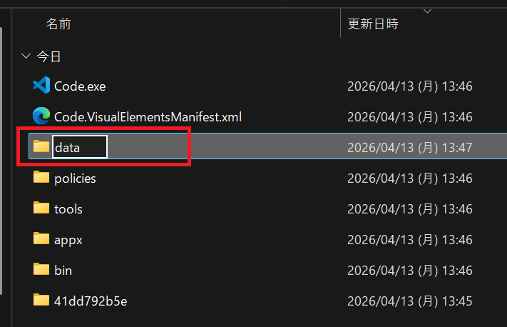 dataフォルダが存在することで、VS Codeは設定、キャッシュ、拡張機能をすべてこのフォルダ内に保存するようになり、ポータブルモードとして動作を開始します。