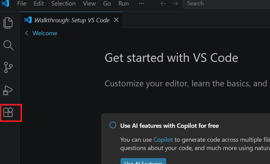 - 画面左側のサイドバーにある Extensionsアイコン(四角いブロックのマーク)をクリックします。