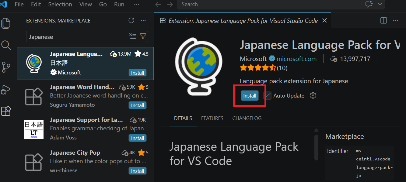 Japaneseと入力します。 - Microsoft公式の 「Japanese Language Pack for Visual Studio Code」 が表示されるので、