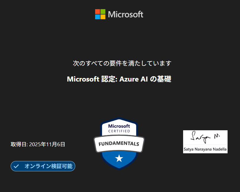 本日、Microsoftの認定資格 「AI-900: Microsoft Azure AI Fundamentals」 に合格しました。